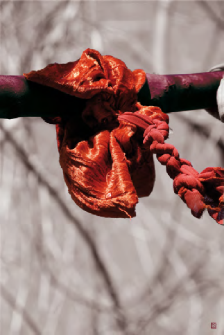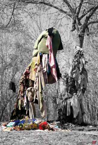 Nature Humaine 3, Arbres à loques, arbres de santé, intervention bénévole de l’artiste paysagiste Béatrice Saurel au Belvédère des Jardins de Barbirey pour « Jardin Art & Soin », association pour la création de soins dans les établissements de santé.