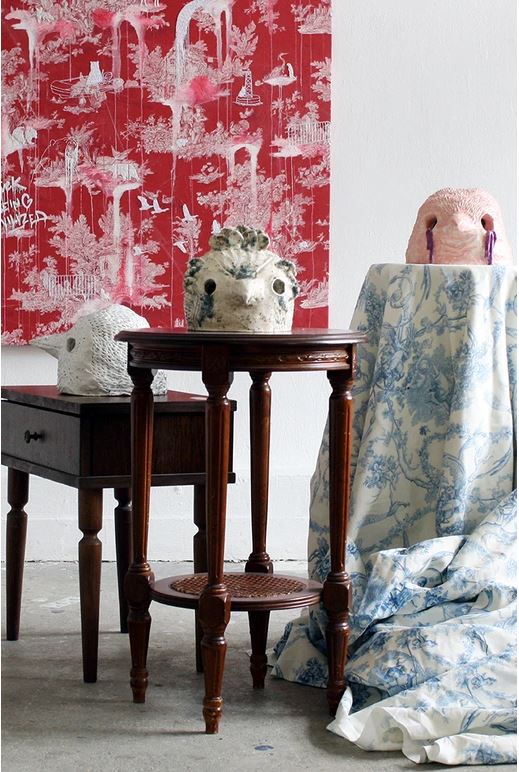Pour cette exposition, l’artiste se réfère plus particulièrement à la crise climatique et aux désastres écologiques. Dans les toiles rouges “Dérèglements” au centre de l’exposition, le monde sauvage apparaît fantomatique. Il hante les scènes pastorales de la toile de Jouy et se mêle à des éléments urbains issus d’un monde qui n’est plus. L’installation murale “Fragments d’un monde perdu” mêlant à la fois morceaux de toile de Jouy, mouchoirs brodés et céramiques, prolonge cette idée puisqu’elle présente un monde éclaté, chaotique à la fois merveilleux et inquiétant. Cet antagonisme se retrouve aussi dans la toile “L’envolée”. Sur de la toile imprimée fleurie est représenté un vol d’oiseau, phénomène naturel appelant à la contemplation. Cependant, cette vision poétique est perturbée par des taches décolorées pouvant être lues autant comme des nuages que comme des fumées annonciatrices de mauvais présages provoquant l’échappée des oiseaux. Dans “Nous sommes les oiseaux de la tempête qui s’annonce”, les envolées se font ici nuées ou combats. Si l’oiseau peut apparaître comme un être inoffensif et fragile, en grand nombre, celui-ci devient menaçant comme l’a bien souligné le film “Les oiseaux” d’Alfred Hitchcock qui a aujourd’hui largement irrigué notre imaginaire collectif. Cette toile dont le titre est emprunté à un poème de Voltairine de Cleyre, féministe et anarchiste américaine, peut aussi être interprétée comme une référence aux luttes sociales et à la chorégraphie qui se met en place lors de chacune des manifestations. Le titre de l’exposition “ Entends-tu le silence des oiseaux ? “ n’est d’ailleurs pas sans rappeler le chant des partisans “Ami, entends-tu le vol noir des corbeaux sur nos plaines ….” appelant à la résistance.