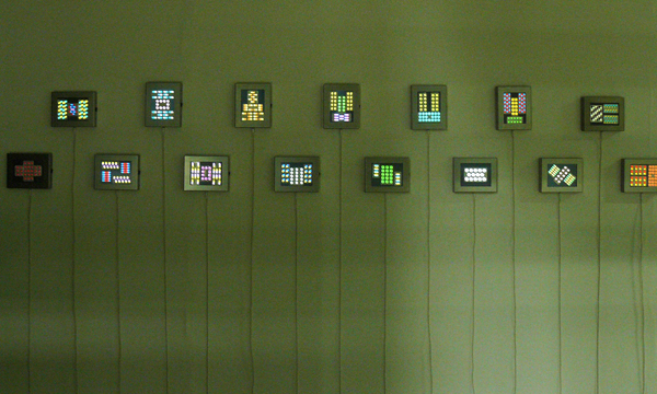C'est à partir de blisters de médicaments évidés que l'artiste compose ces petits tableaux électroniques dont l'esthétique dialogue autant avec la peinture qu'avec les jeux vidéos. De savants algorythmes programment les déplacements des personnages et font varier les boucles temporelles d'un blister à l'autre au sein d'un même tableau. L'artiste joue des interférences visuelles comme un DJ associe les sons. Une métaphore ludique de l'emprise de ces petites gélules sur notre santé...